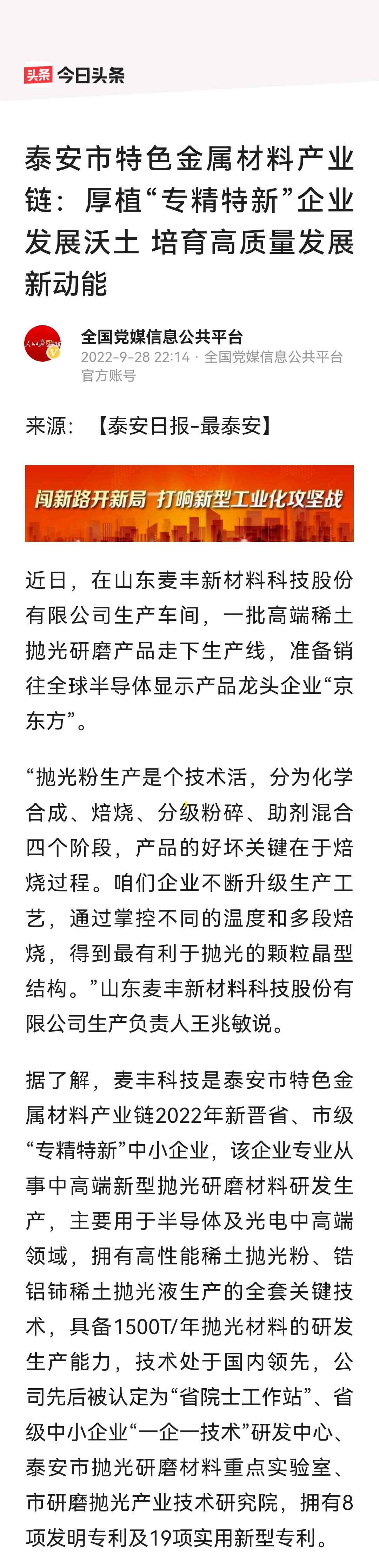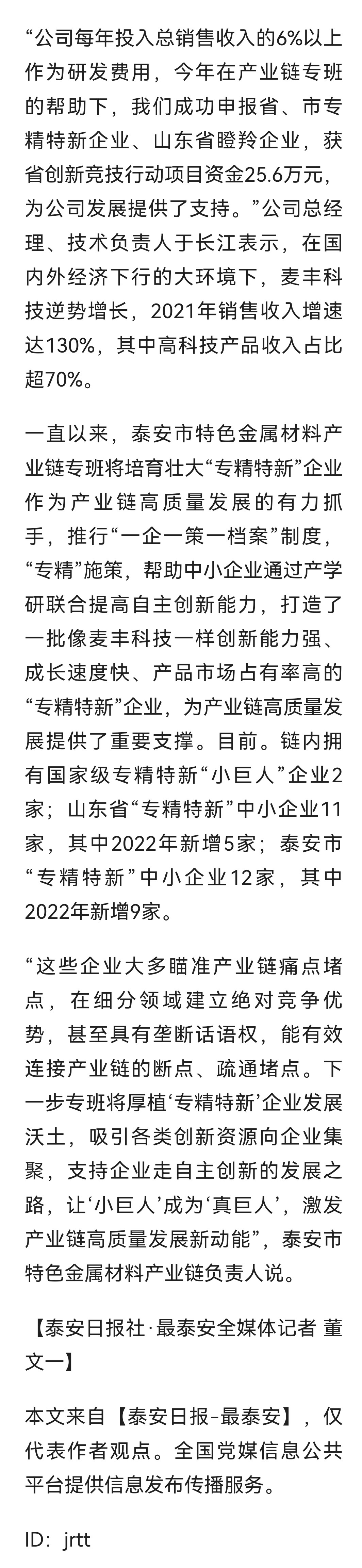 近日,大眾網(wǎng)、泰山日?qǐng)?bào)、ZAKER泰安等多家媒體以麥豐為主線,刊發(fā)《泰安市特色金屬材料產(chǎn)業(yè)鏈:厚植“專精特新”企業(yè)發(fā)展沃土 培育高質(zhì)量發(fā)展新動(dòng)能》文章。