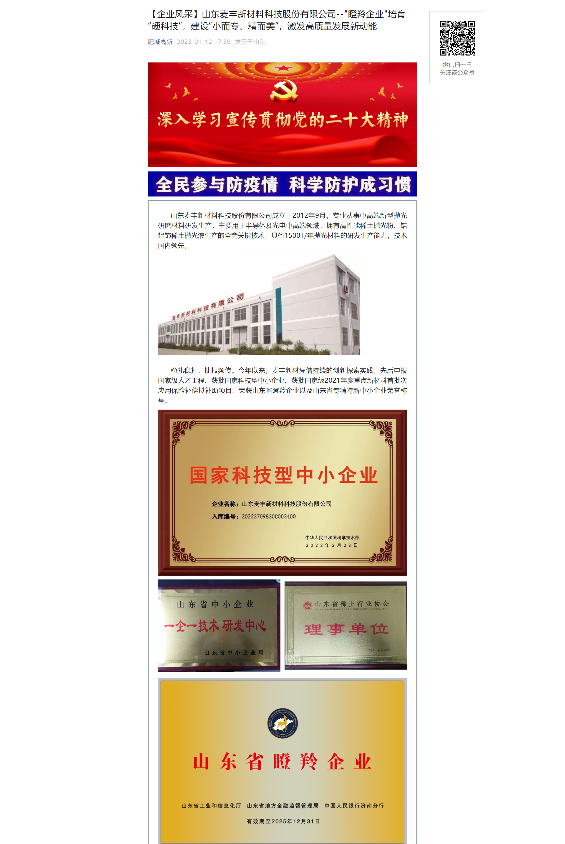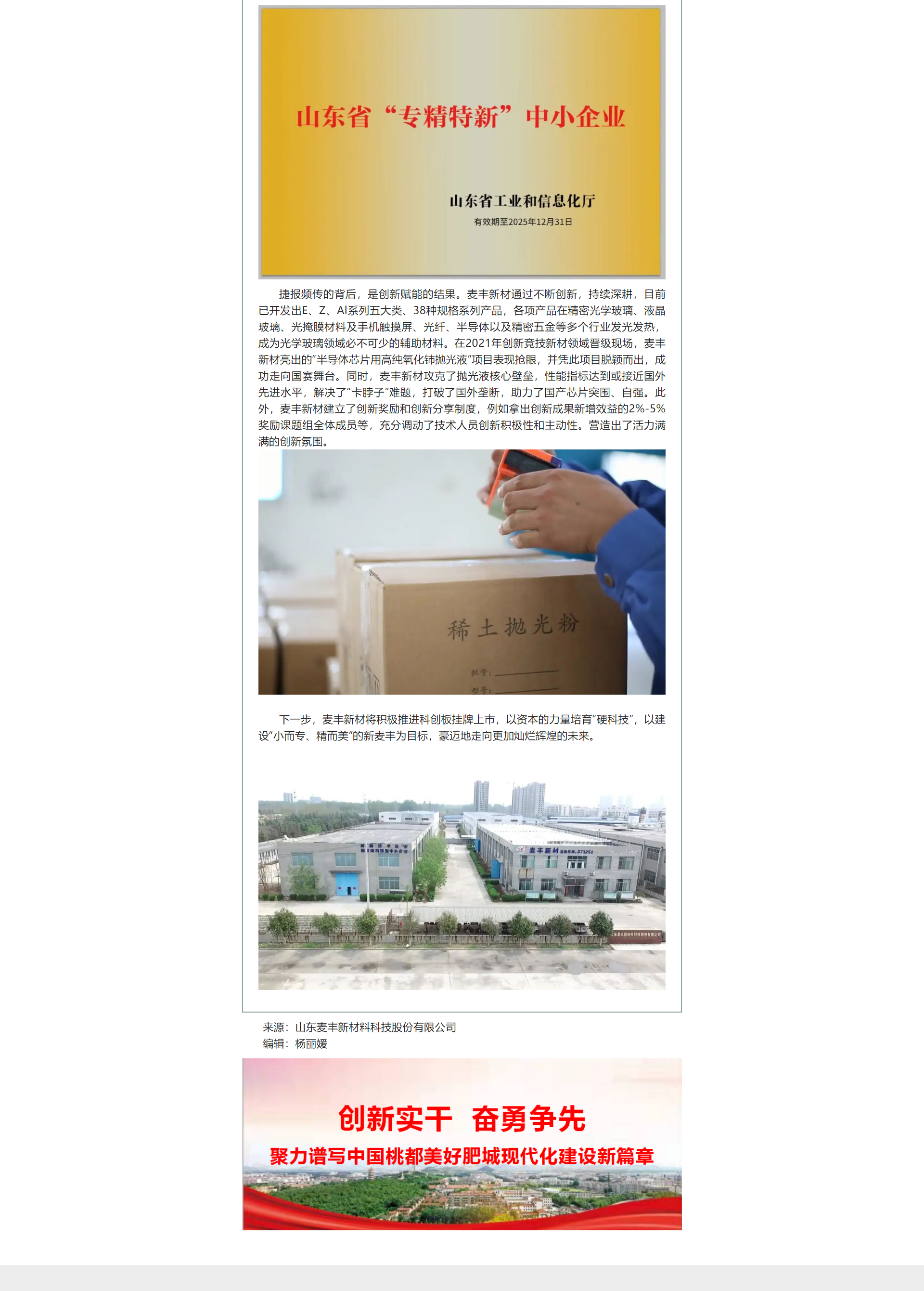肥城高新公眾號(hào)刊發(fā)《山東麥豐新材料科技股份有限公司"瞪羚企業(yè)"培育“硬科技”,建設(shè)“小而專、精而美”,激發(fā)高質(zhì)量發(fā)展新動(dòng)能》文章